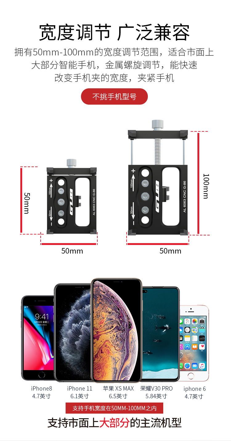 尺寸:長50mm(可調(diào)至100mm),寬50mm,夾子口徑Φ31.8mm