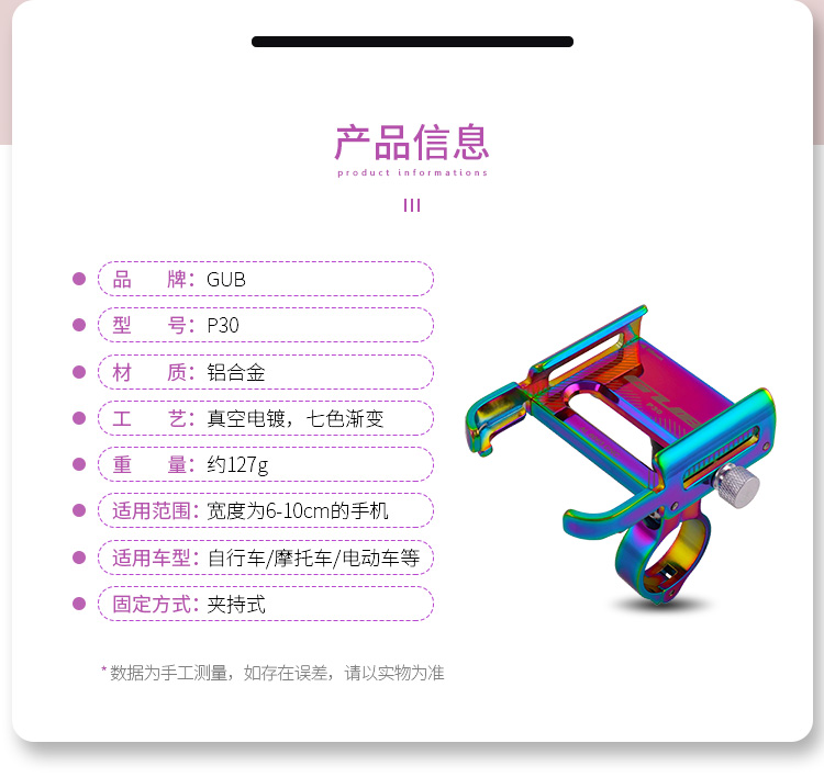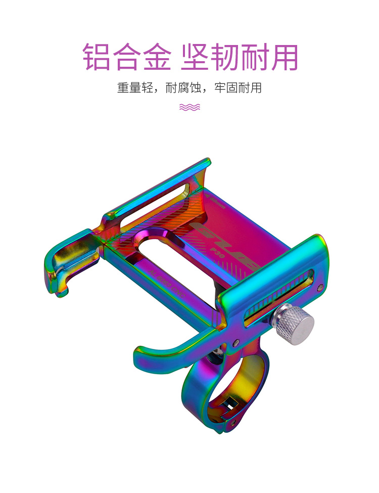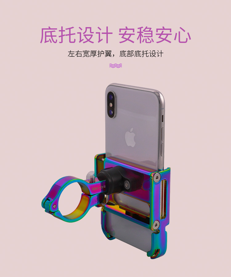 特點:鋁合金架體,七彩電鍍彰顯個性,高兼容性不挑手機(jī)型號,自行車、電動車等都可使用!