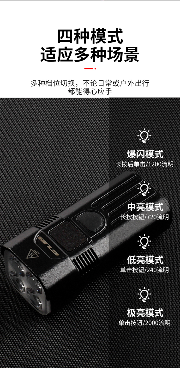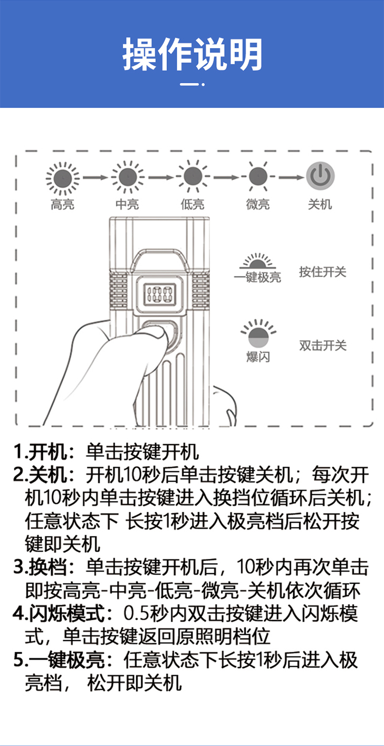 燈光模式:高亮/中亮/低亮/微亮/一鍵極亮/爆閃