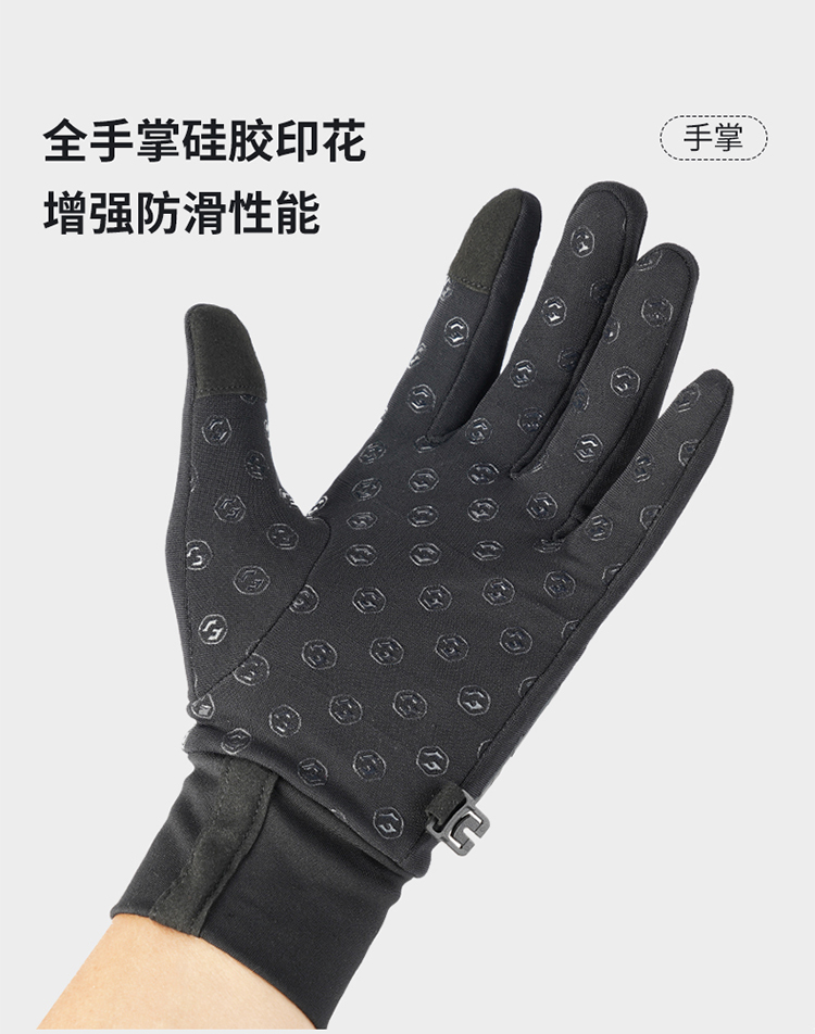 材質(zhì):高彈面料手背、絲絨內(nèi)里、硅膠印刷掌面條紋、拇指食指導(dǎo)電布