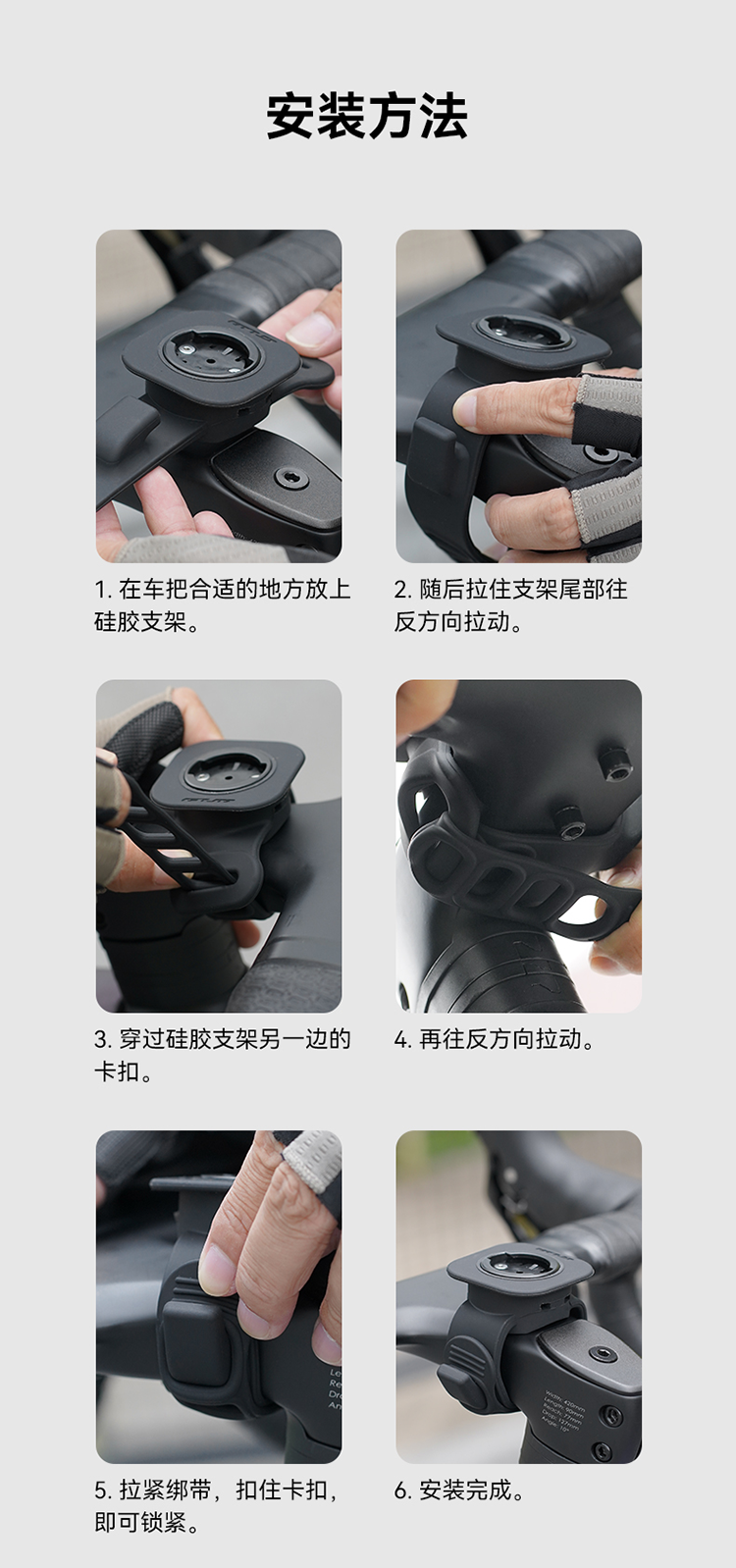 特點(diǎn):硅膠架體,不傷車把,安裝方便,兼容多種碼表