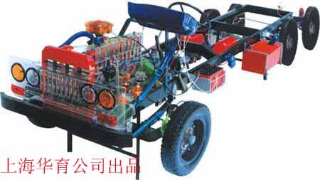本品選用透明有機(jī)玻璃制作,內(nèi)中部件均以硬質(zhì)塑料料加工,用 螺絲固定在金屬高溫烘漆而成的車架上。各總成部分都以壓模成形加 工,代替過去膠粘合的方法,使產(chǎn)品在強(qiáng)度上有很大提高。發(fā)動(dòng)機(jī)總成用電機(jī)驅(qū)動(dòng),在油門處設(shè)有調(diào)速裝置,能演示發(fā)動(dòng)機(jī)轉(zhuǎn)速高低。離合器分離明顯,操縱靈活,離合器外殼整體壓模而成,變速箱和各檔齒輪用各種顏色表示,換檔靈活,手制動(dòng)美觀。后橋外形壓模而成,內(nèi)中主減速、差速轉(zhuǎn)動(dòng)自如,輪轂剎蹄壓模成型,剎蹄可調(diào)節(jié),前橋輪鼓可調(diào)整,轉(zhuǎn)向裝置以及電瓶、油箱、水箱,制動(dòng)管路分布清楚一目了然。電路采用對(duì)插件前后分布,燈架、風(fēng)窗、儀表板、后燈架用透明有機(jī)玻璃壓模成整體美觀逼真。
