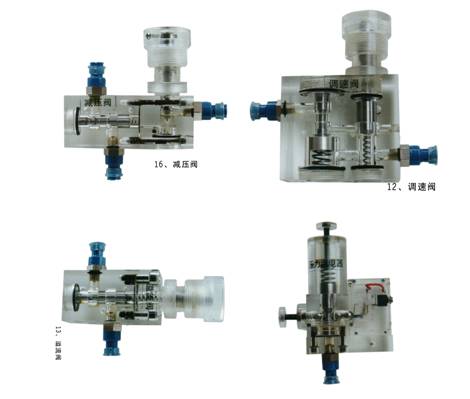 3、實訓(xùn)元件均為透明有機(jī)材料制成,便于了解掌握幾十種常用液壓元件的結(jié)構(gòu),性能及用途。掌握幾十種基本回路的工作原理,實驗組裝回路快捷、方便。
