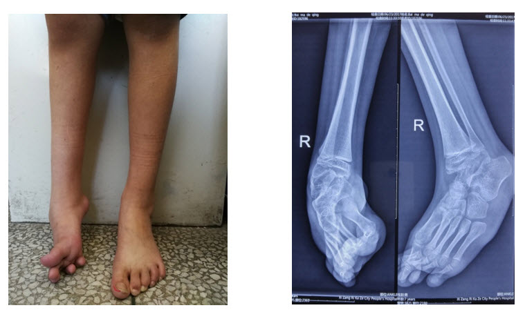 患兒為來(lái)自日喀則市崗巴縣的7歲藏族女孩,出生后發(fā)現(xiàn)右腳呈內(nèi)翻畸形,1歲時(shí)畸形加重,不能正常走路,在當(dāng)?shù)蒯t(yī)院做了跟腱延長(zhǎng)術(shù),但隨著年齡增長(zhǎng),畸形加重跛行更為明顯,行走時(shí)腳痛嚴(yán)重。在幾乎絕望之時(shí),患兒家長(zhǎng)找到了日喀則市人民醫(yī)院骨科援藏專(zhuān)家施忠民主任。已經(jīng)圓滿(mǎn)完成了一年援藏工作即將啟程回上海的施主任,看著小女孩因畸形導(dǎo)致殘疾的腳和家長(zhǎng)憂(yōu)心的眼神,決定為小女孩做手術(shù),小女孩和其父母的臉上露出了久違的希望的笑容。