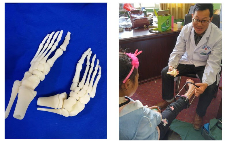 圖3:3D打印的模型(左側(cè)正常足,右側(cè)患足) 圖4:術(shù)前施忠民主任手持模型和支架做術(shù)前準(zhǔn)備
