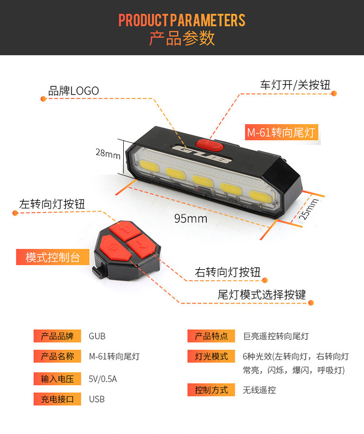 重量:約50克(尾燈)、約13克(遙控器)、約125克(總毛重)