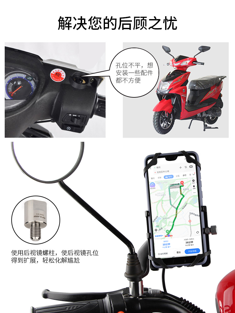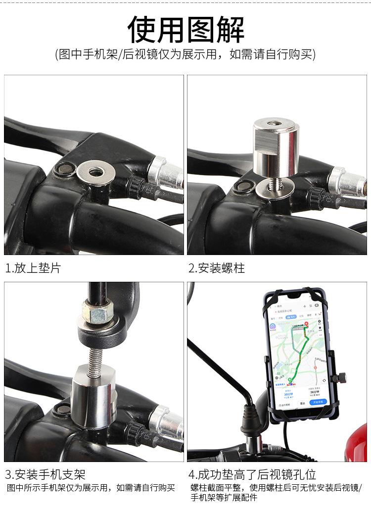 簡(jiǎn)介:此配件為后視鏡輔助配件,采用不銹鋼材質(zhì),耐用不生銹,用于摩托車/電動(dòng)車后視鏡孔位的擴(kuò)展,起到墊高或更好適配的作用。