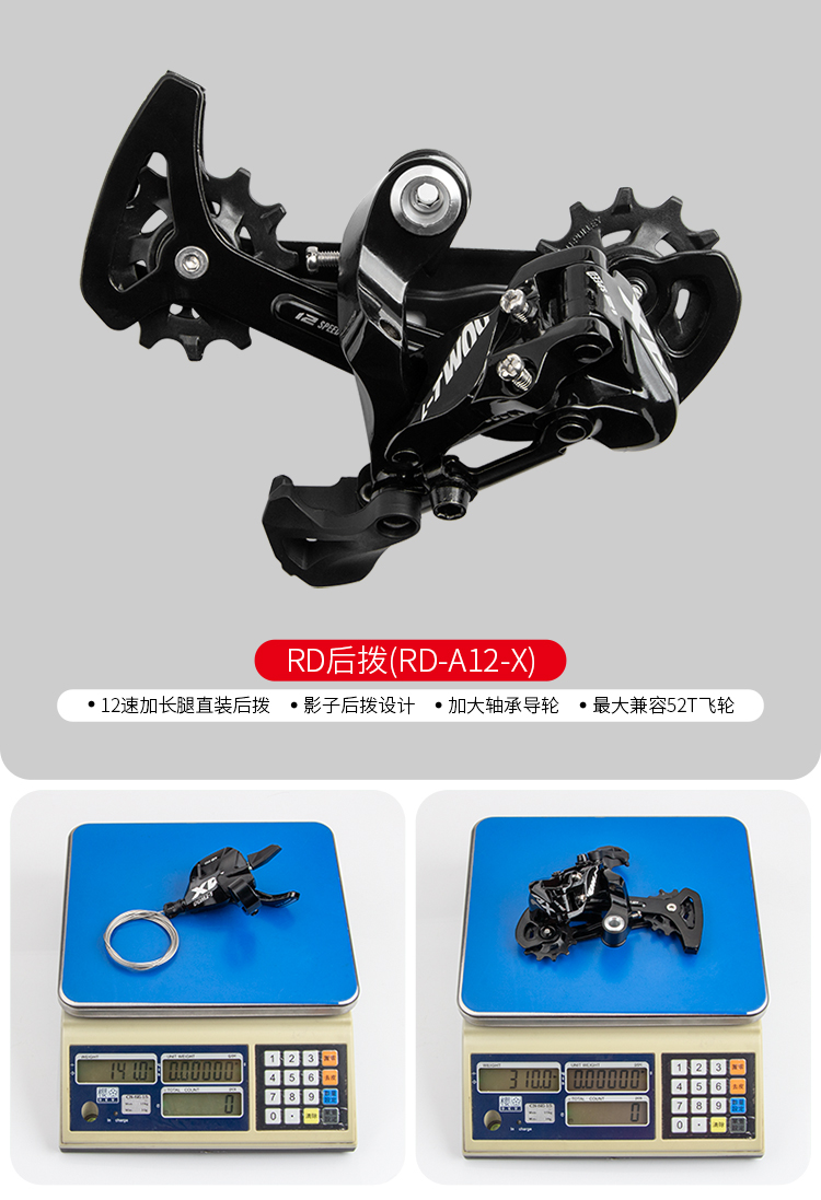 后撥:12速加長腿直裝后撥,影子后撥設(shè)計(jì),加大軸承導(dǎo)輪,最大兼容52T飛輪