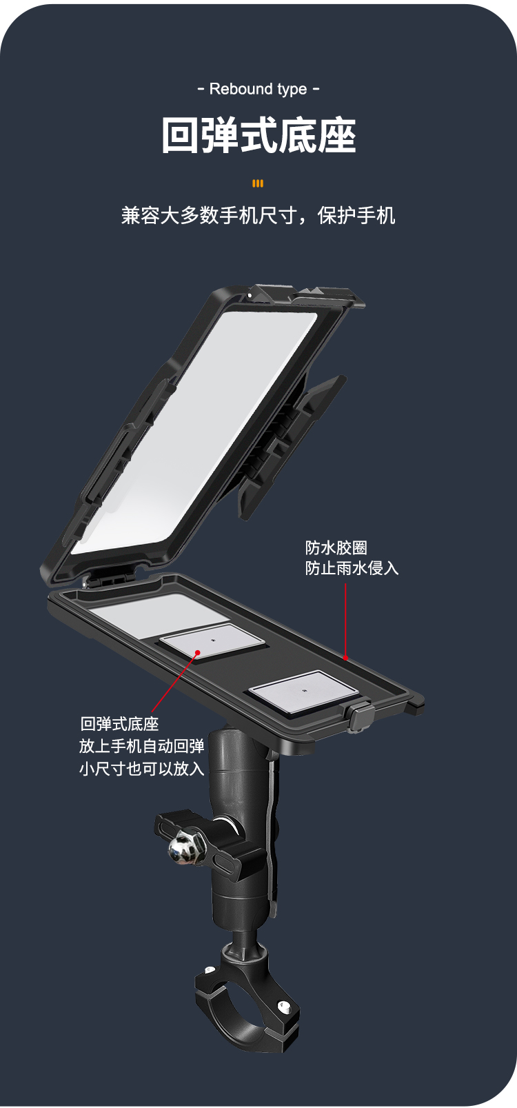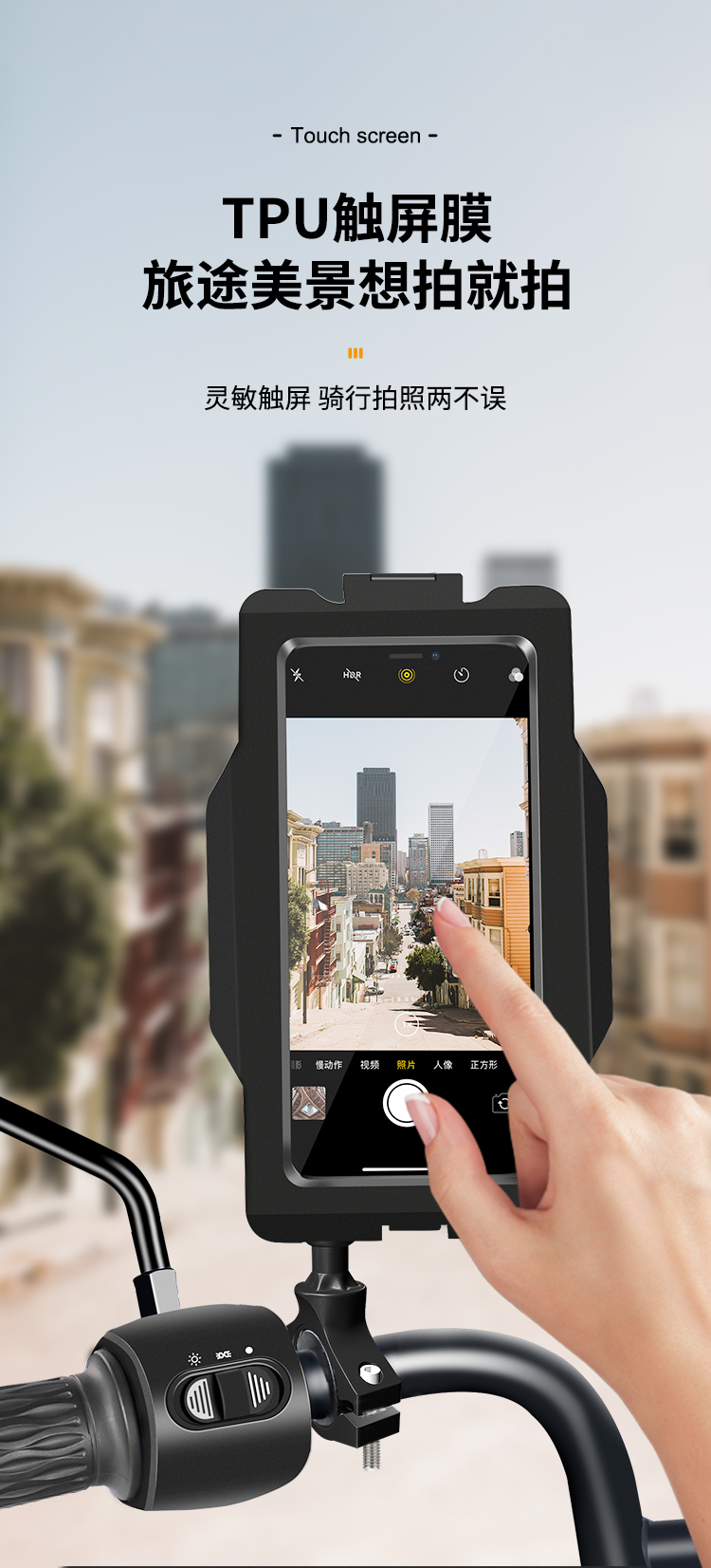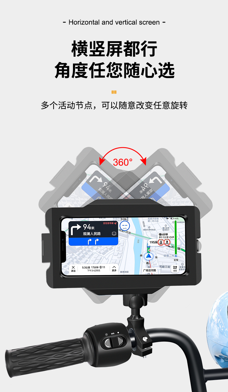 特點:鋁合金支撐架,全封閉手機盒,防雨無憂,高兼容性不挑手機型號,摩托車、電動車等都可使用,滿足多場景使用需求。