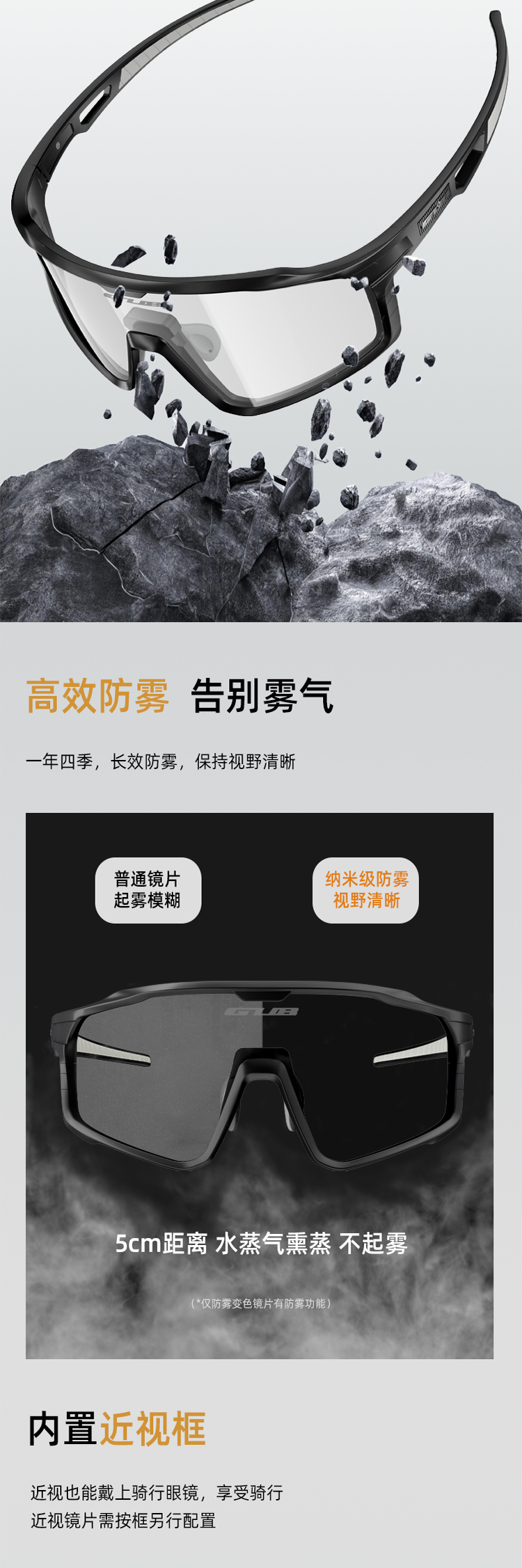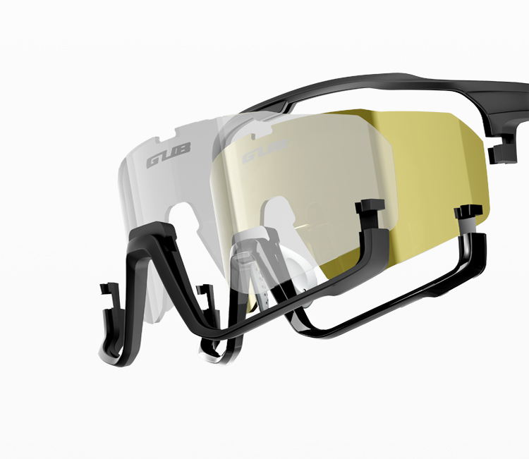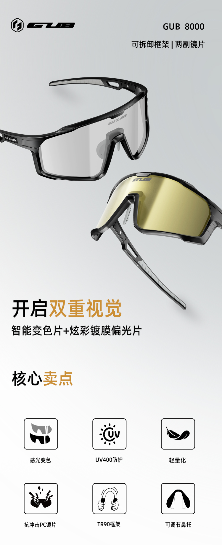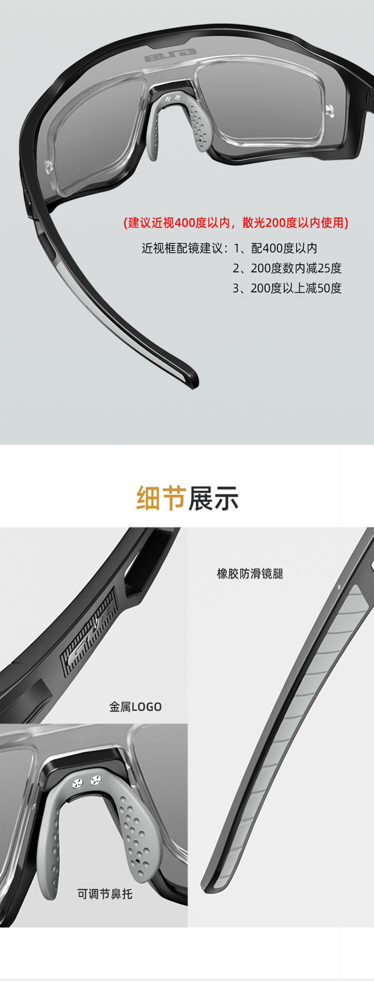 特點:標配透明變色片,另贈送一副偏光鏡片和下框,一副眼鏡,四種顏色搭配,滿足個性需求。專利設(shè)計上下可拆卸框,快速更換鏡片。