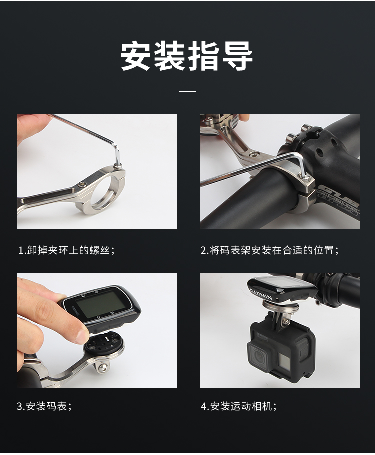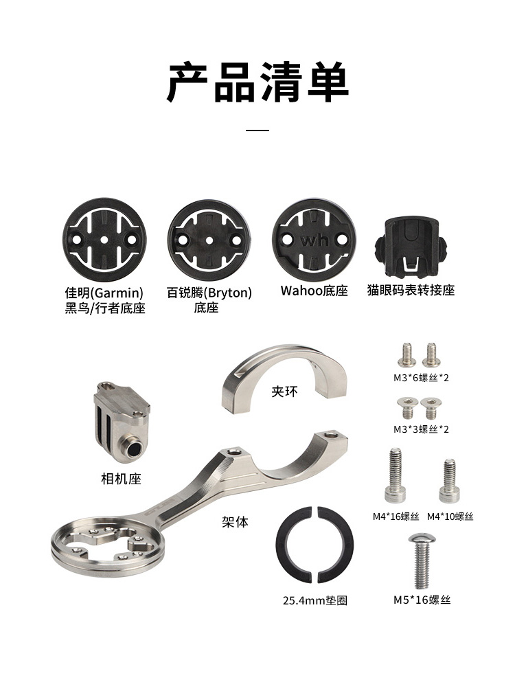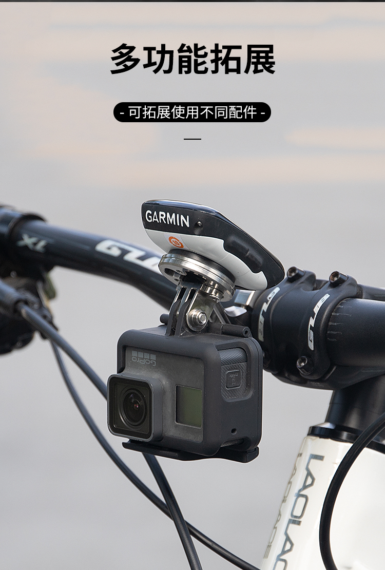 配置:配運動相機轉(zhuǎn)接座,wahoo、佳明、百銳騰和貓眼碼表接座、25.4mm墊圈一對