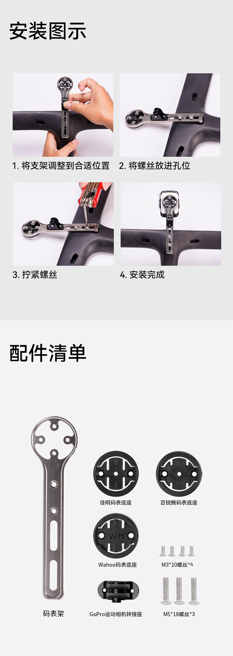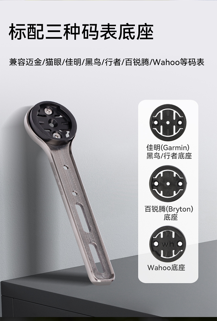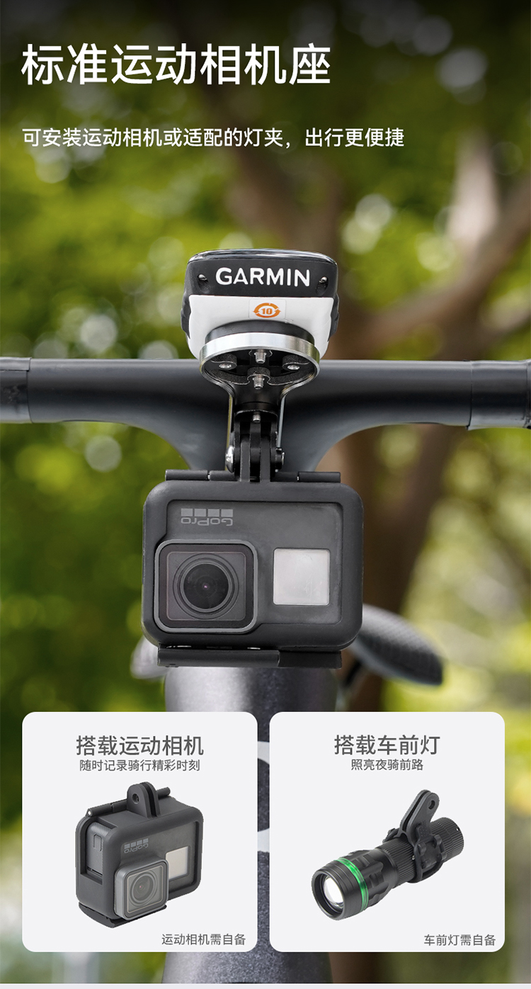 特點(diǎn):鈦合金超輕架體,居中安裝節(jié)省空間(一體把專用),兼容多種碼表,標(biāo)配運(yùn)動相機(jī)轉(zhuǎn)接座,可擴(kuò)展使用運(yùn)動相機(jī)等配件