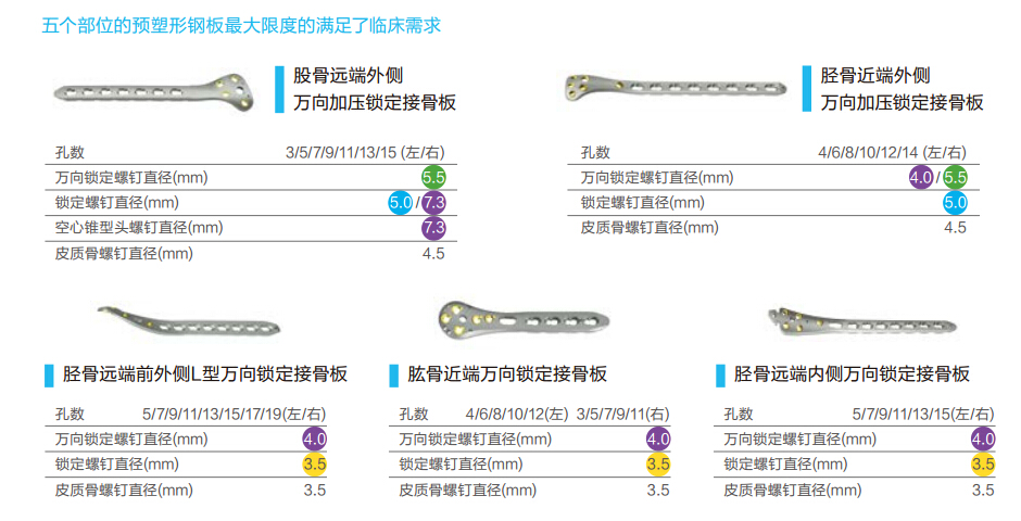 該系統(tǒng)提供了固定角度鎖定螺釘、可變角度鎖定螺釘和普通螺釘三種螺釘,極大限度的滿足了臨床需求。因此醫(yī)生可以根據(jù)患者不同的骨折類型、骨量和解剖形態(tài)來選擇不同螺釘進(jìn)行固定。